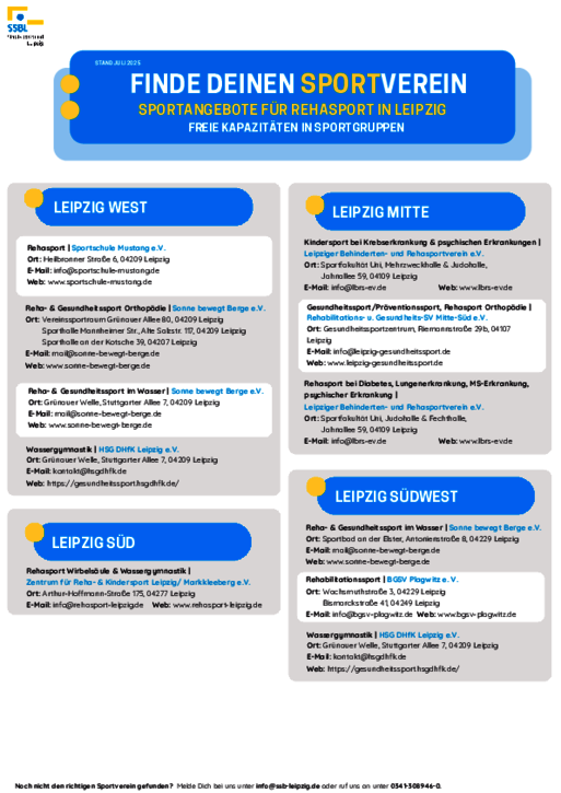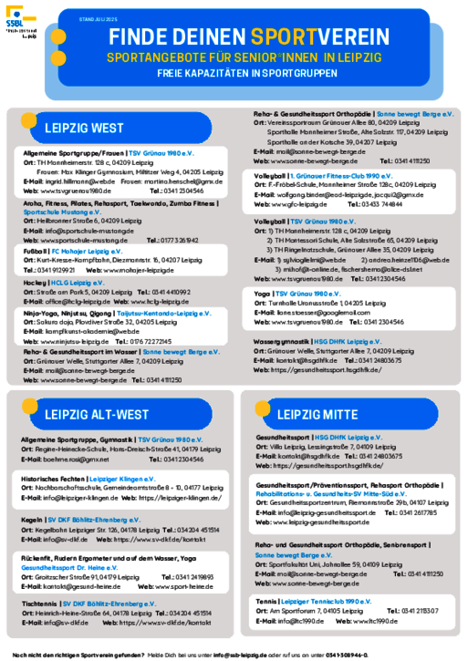Neues Jahr - Neue Vorsätze?! Die Verzeichnisse über freie Kapazitäten in den Leipziger Vereinssportgruppen wurden durch Abfragen in unseren Mitgliedsvereinen aktualisiert bzw. neu erstellt. Dabei erleichtert die Ordnung nach Stadtteilen und Zielgruppen den Findungsprozess.